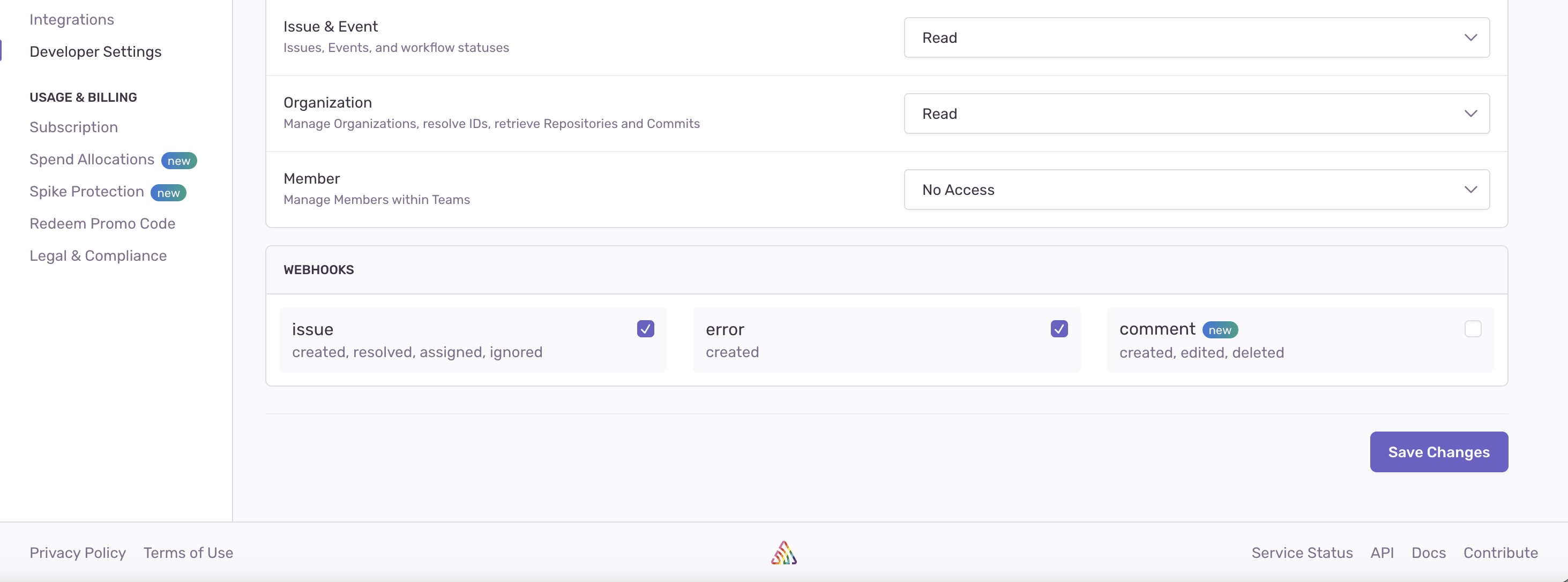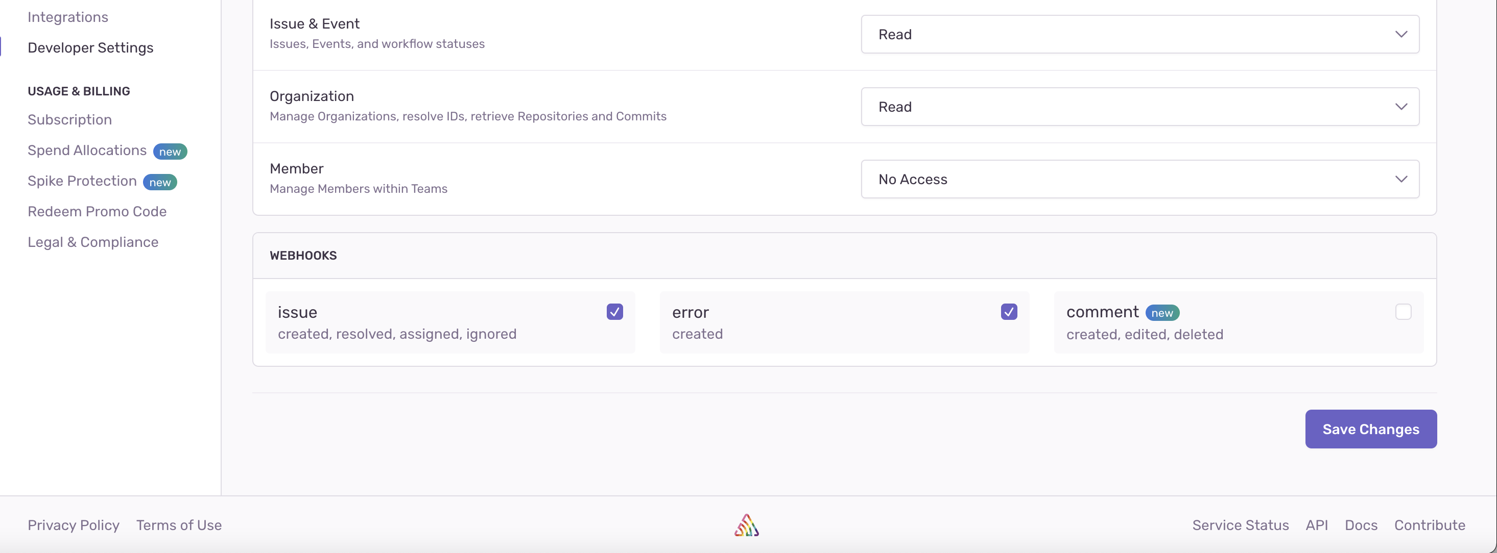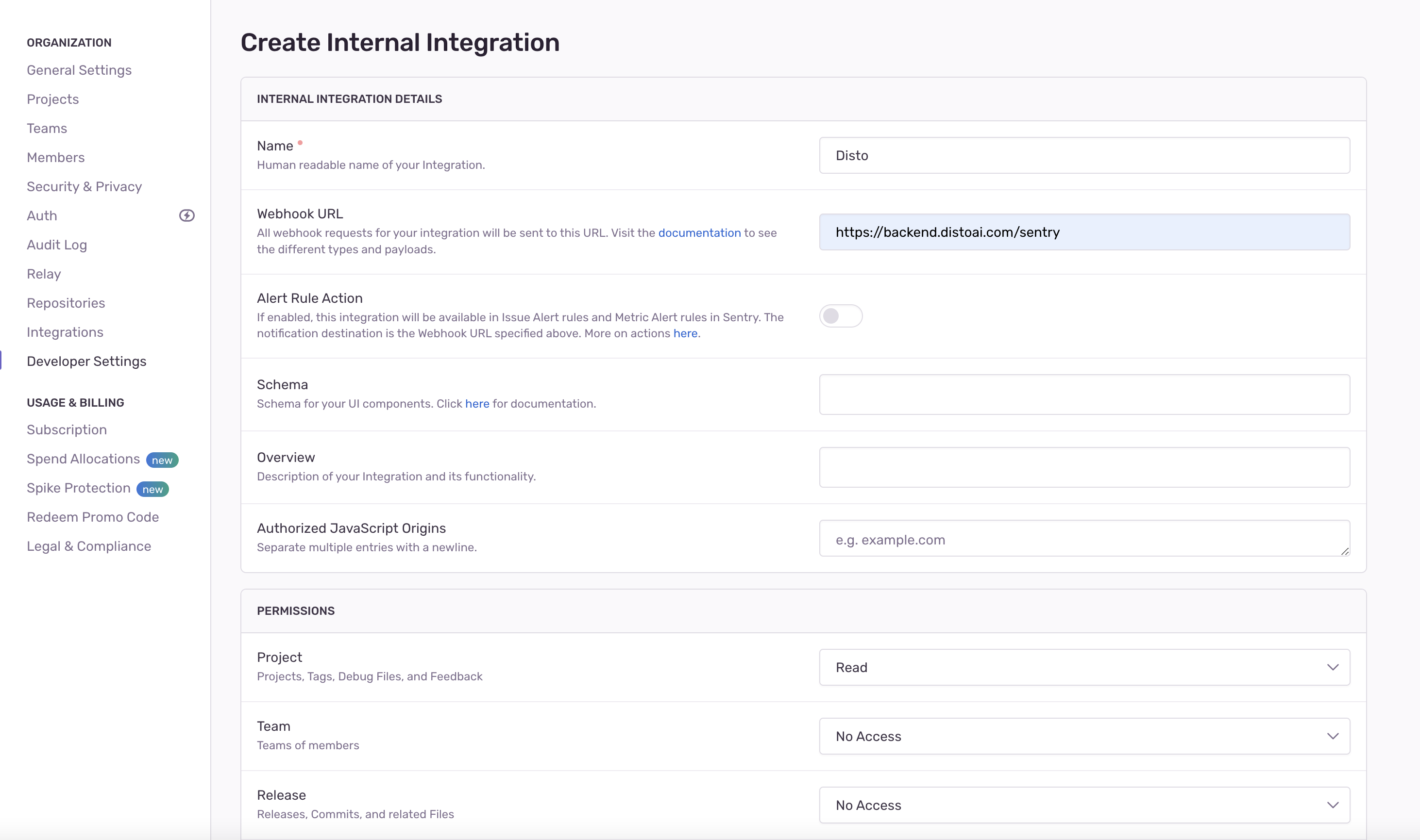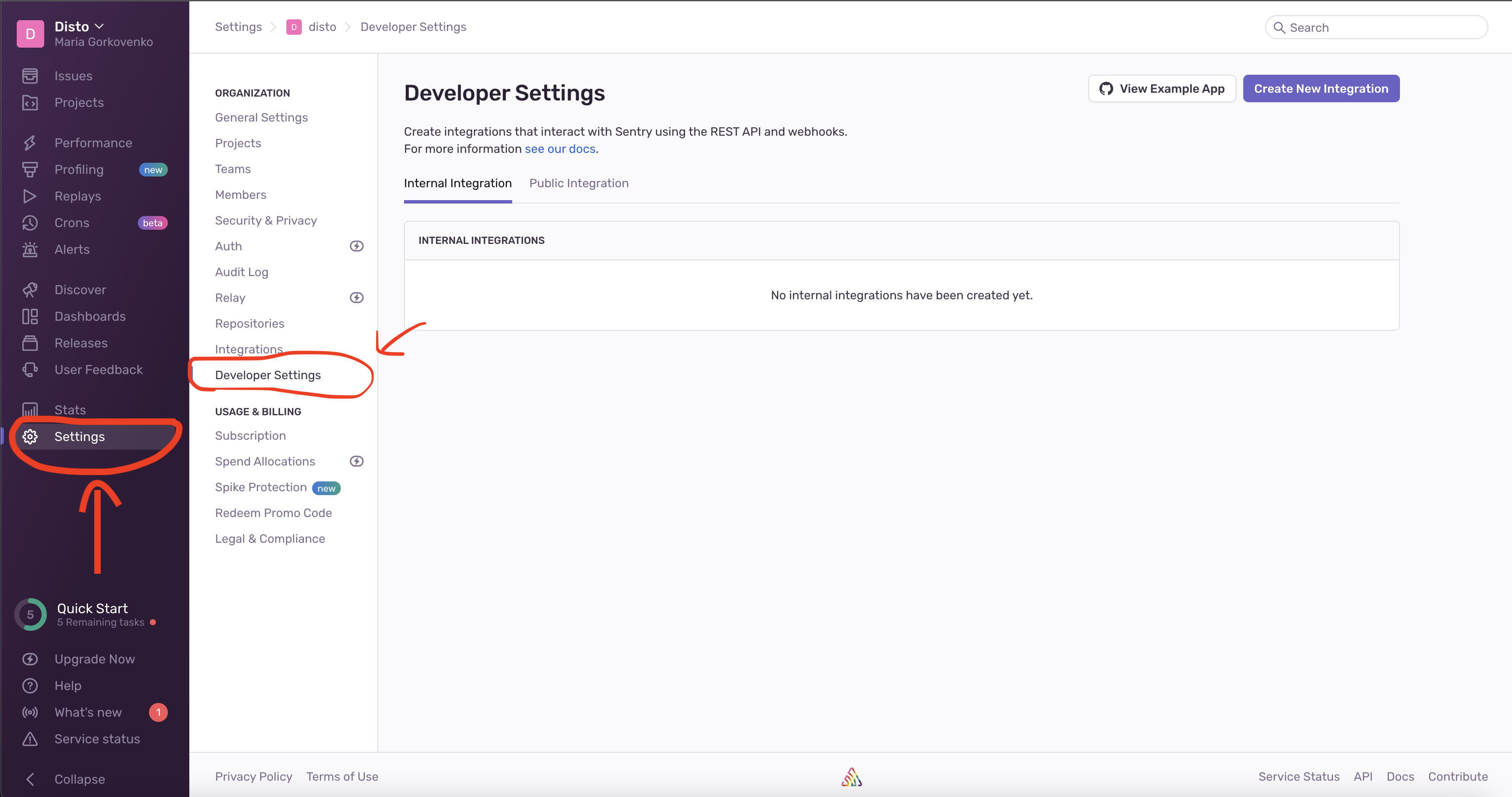 Connect Disto to Sentry so that Disto can receive information about your Sentry errors.- Create an internal Sentry integration to allow Disto’s webhook to receive your error events. Go to the Sentry console. Click on “Settings” -> “Developer Settings”