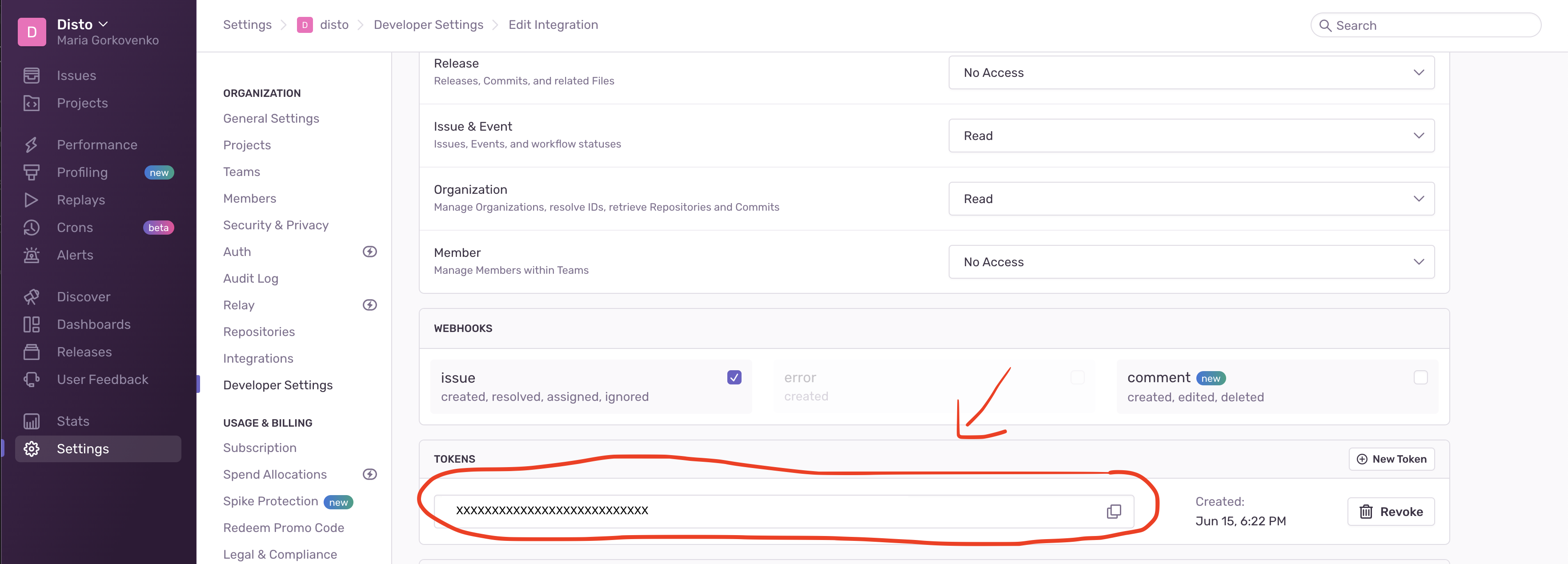Copy this token into Disto and click “Add Token” to add this token to your Disto account. This will allow Disto to access your Sentry error information.