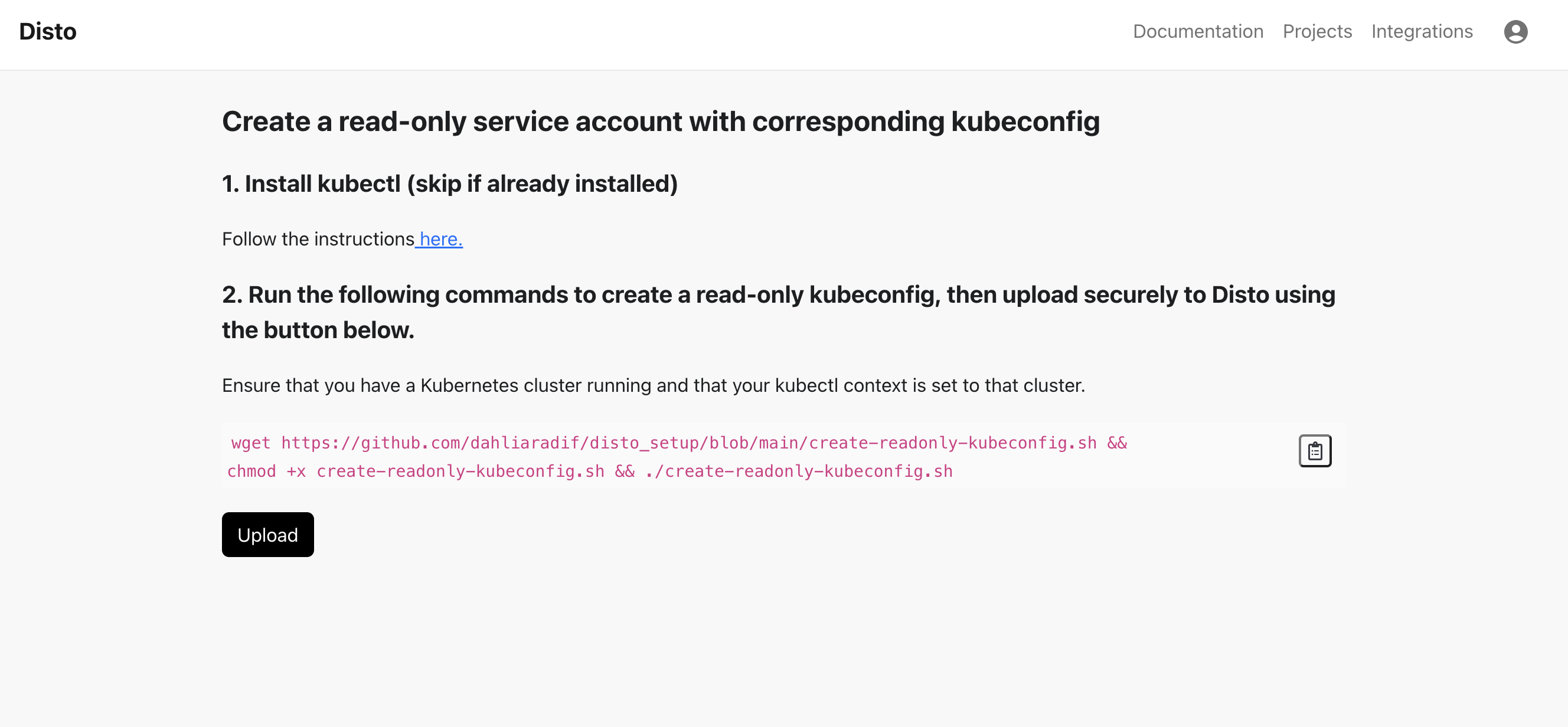 To integrate with Kubernetes, run the command provided by Disto to create a read-only kubeconfig, and upload this securely to Disto. This will allow Disto to run read-only kubectl commands to get data from your cluster.