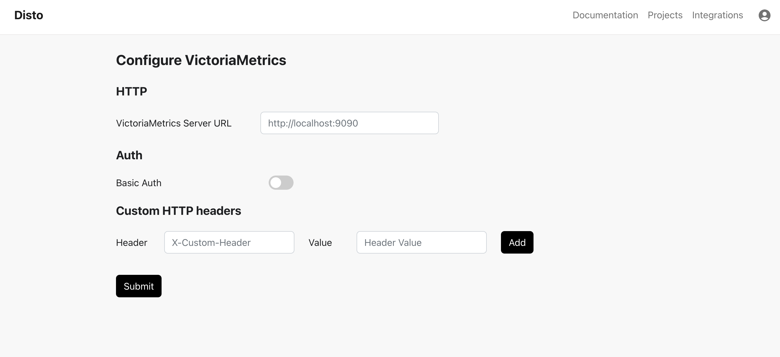 To integrate with VictoriaMetrics, fill out the indicated fields.