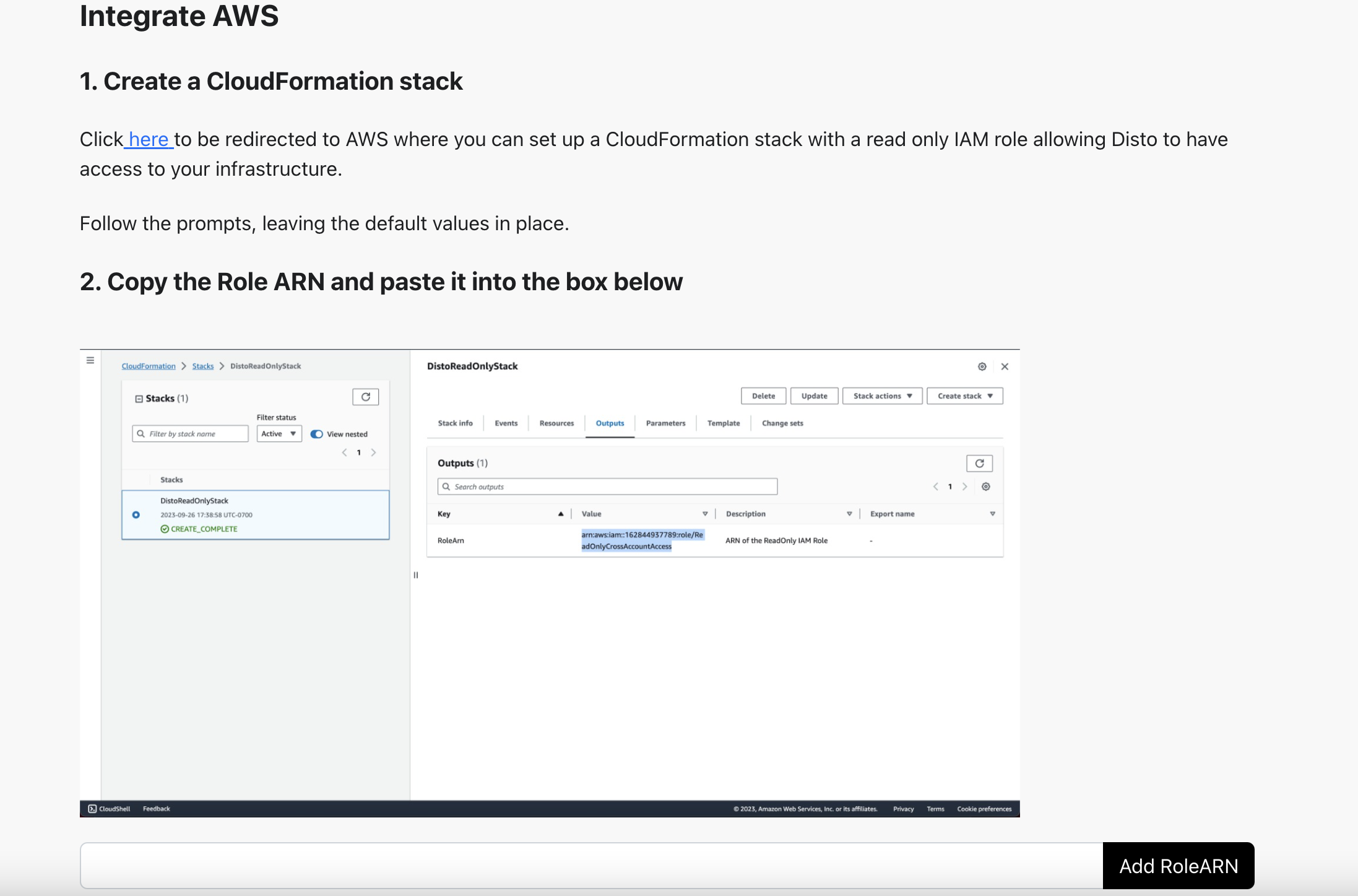 To integrate with AWS, create a CloudFormation stack with a read only IAM role and upload the Role ARN to Disto as indicated below.