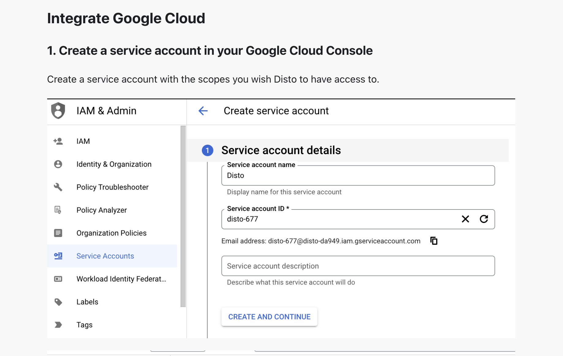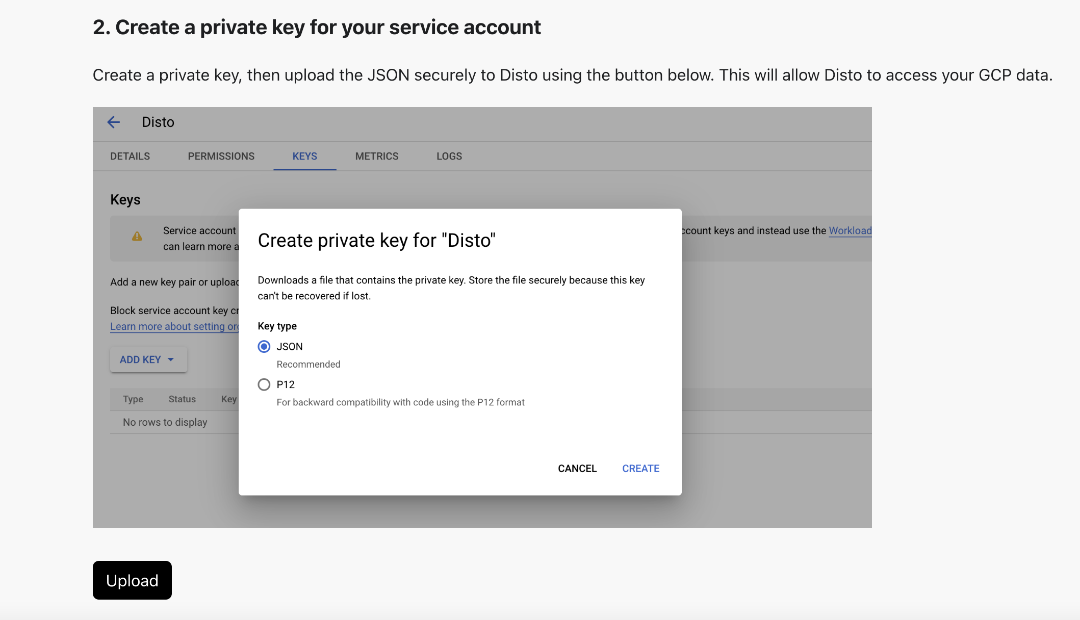 To integrate with Google Cloud, create a service account and create and upload the private key to Disto as indicated below.