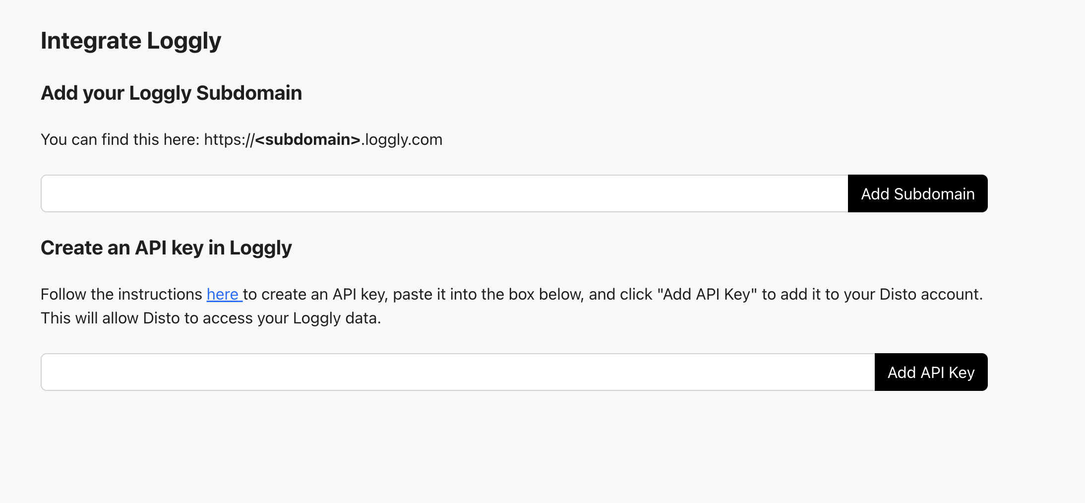 To integrate with Loggly, add your Loggly subdomain and create an API key as indicated below.