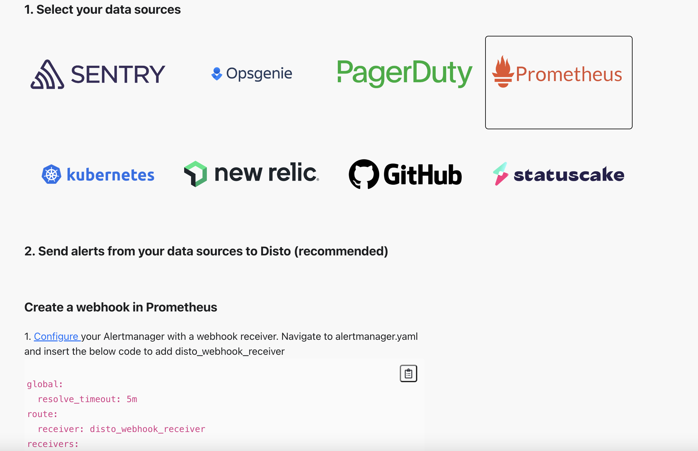 We will build custom integrations for your internal tools, and have them ready by the time you would like to begin a POC. We want to minimize the engineering effort required from your team. We would need documentation on your internal tools and any APIs they have. If you would like to add an integration yourself, you can do so by following the steps below. Click on “Add Custom Integration” and fill out the indicated fields. These will give Disto information about what data can be retrieved from your tools and how to retrieve it.- Name: Display name of the integration