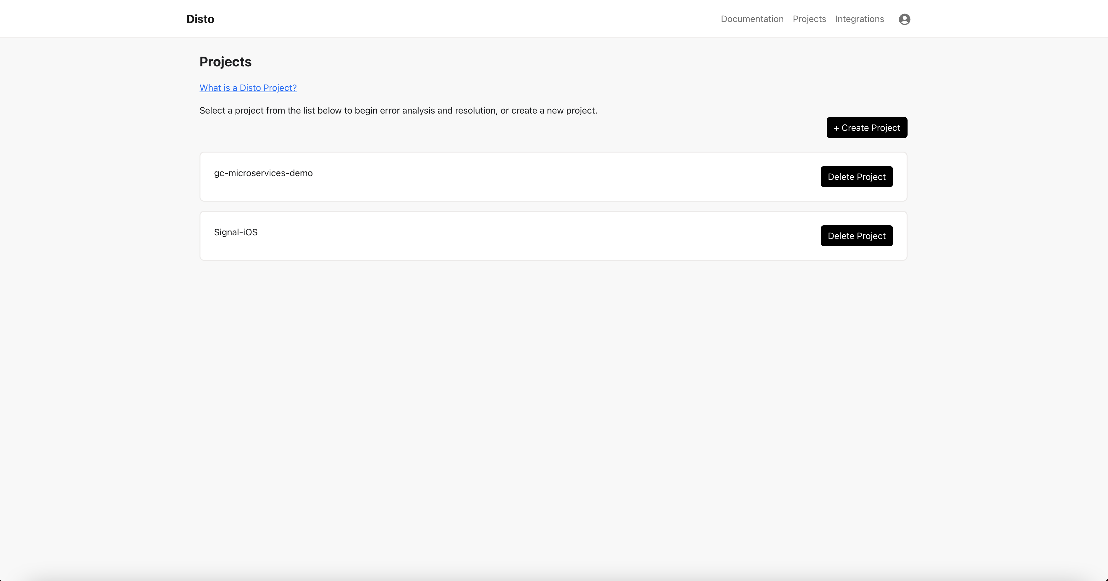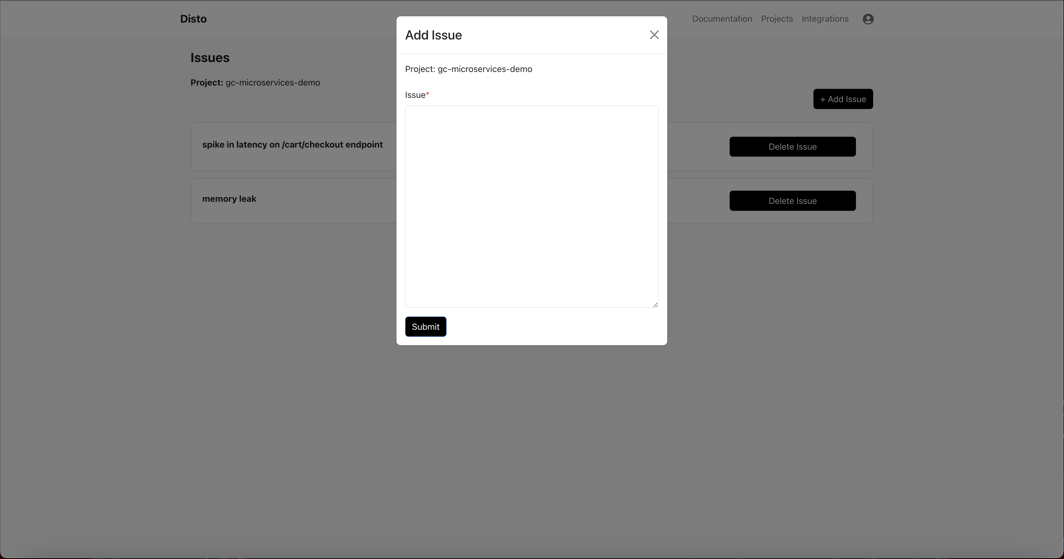 - Click on your project, then click on “Add Issue”. Add a description of the issue and any relevant information you have about it, including any alerts, error messages, logs, etc. Click Submit, and wait for Disto to process the issue and add it to your project. If Disto has been working on a fix for a while, refresh the page.