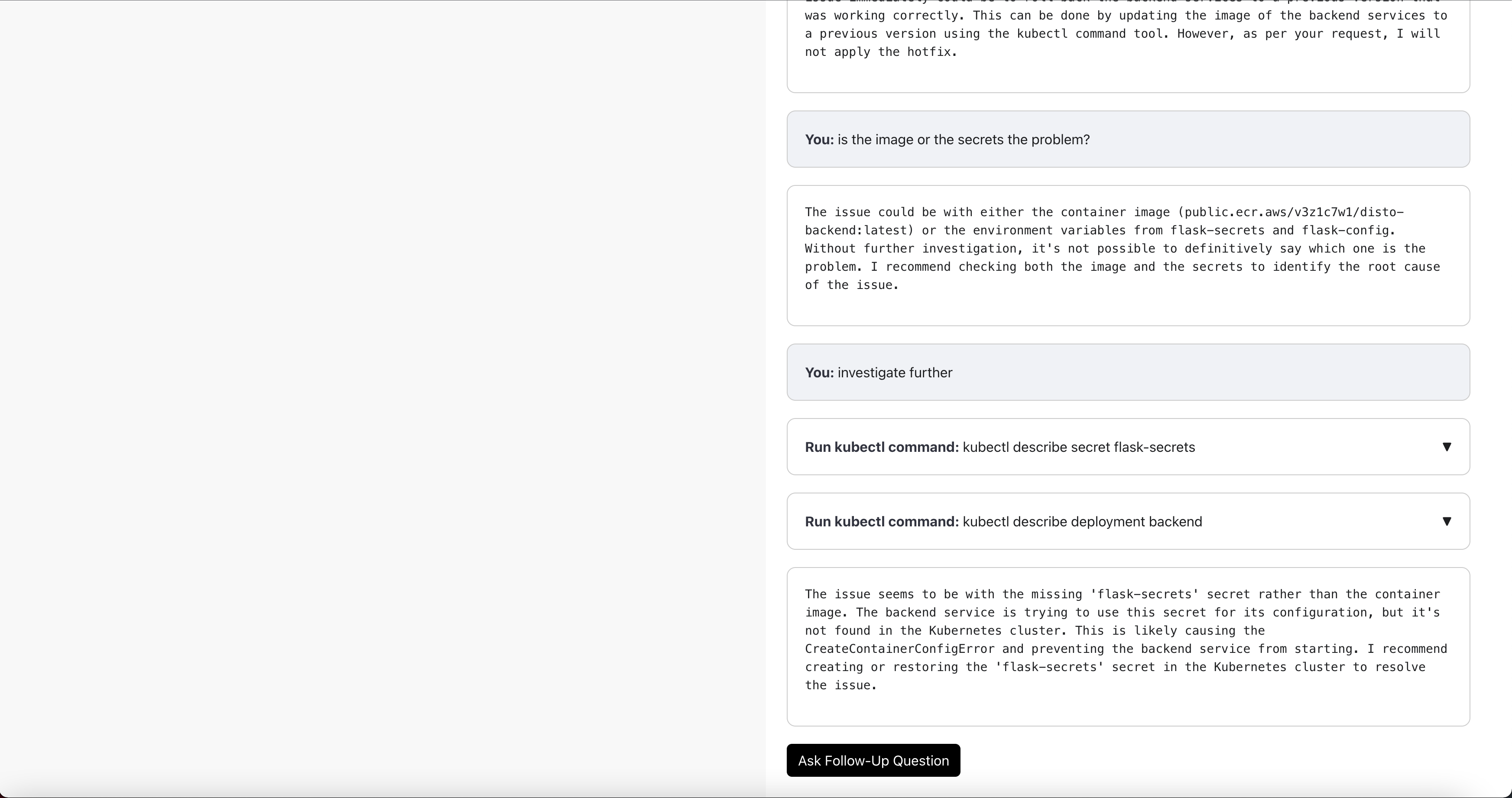 - If you would like to ask a follow up question (or provide feedback, or ask Disto to redo something), scroll down to the bottom of the investigation steps. Then click “Ask Follow-Up Question”. A text box will appear where you can input your question.