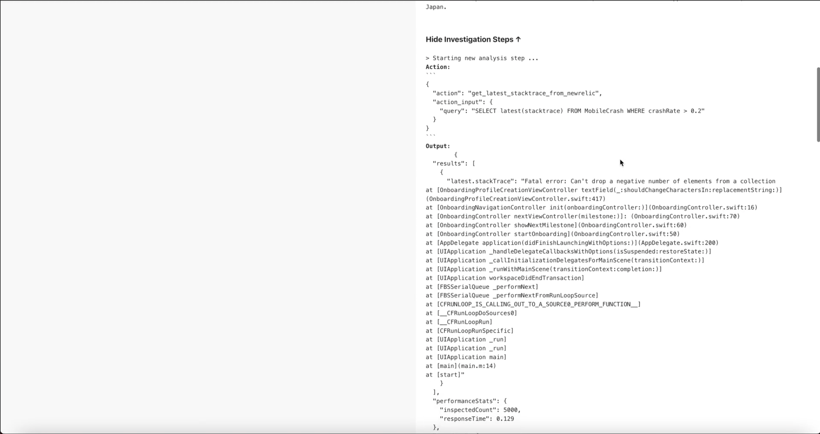 - If you click “Show Investigation Steps”, you can see the steps that Disto took to investigate the issue, each of which include what command, query, or API call it performed, the result, and analysis of the result.