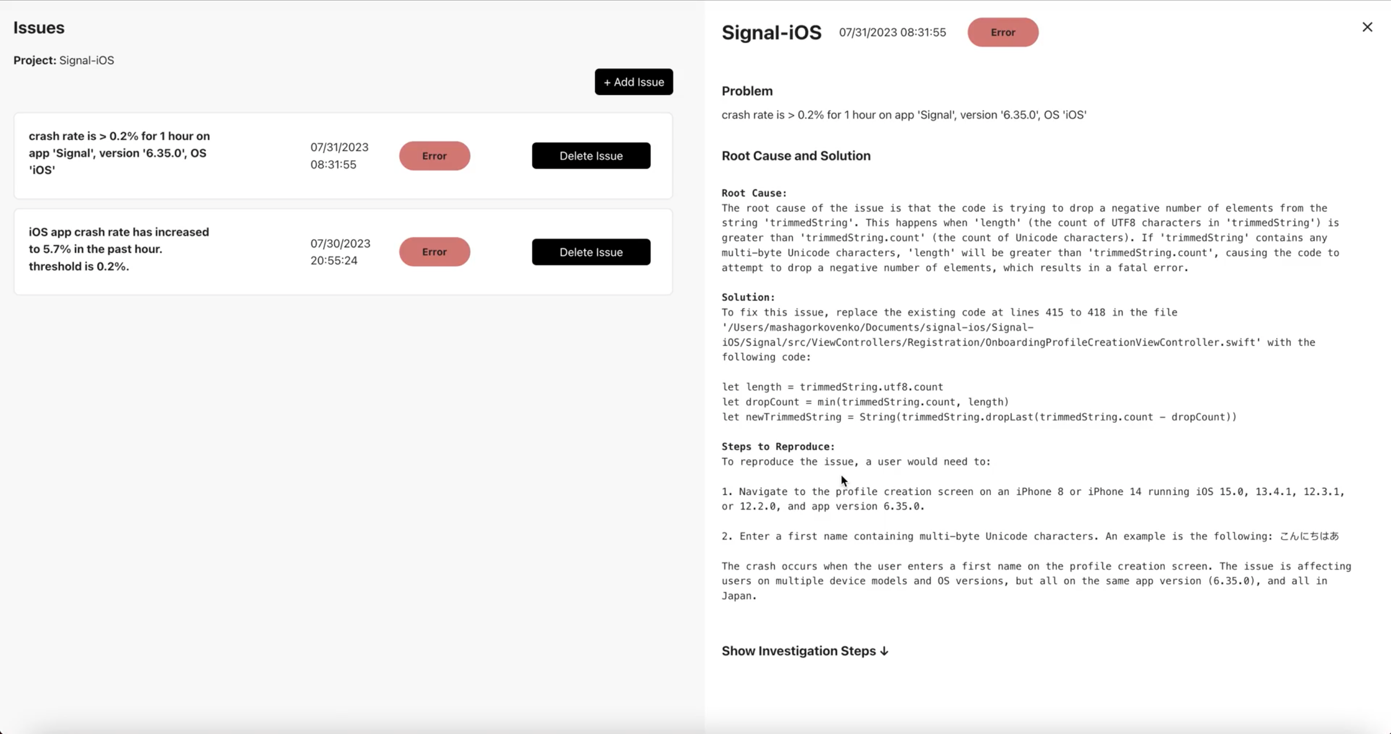 - Click on the issue. Disto shows the root cause, solution, and, if relevant, specific code changes to solve the issue and steps to reproduce the issue.