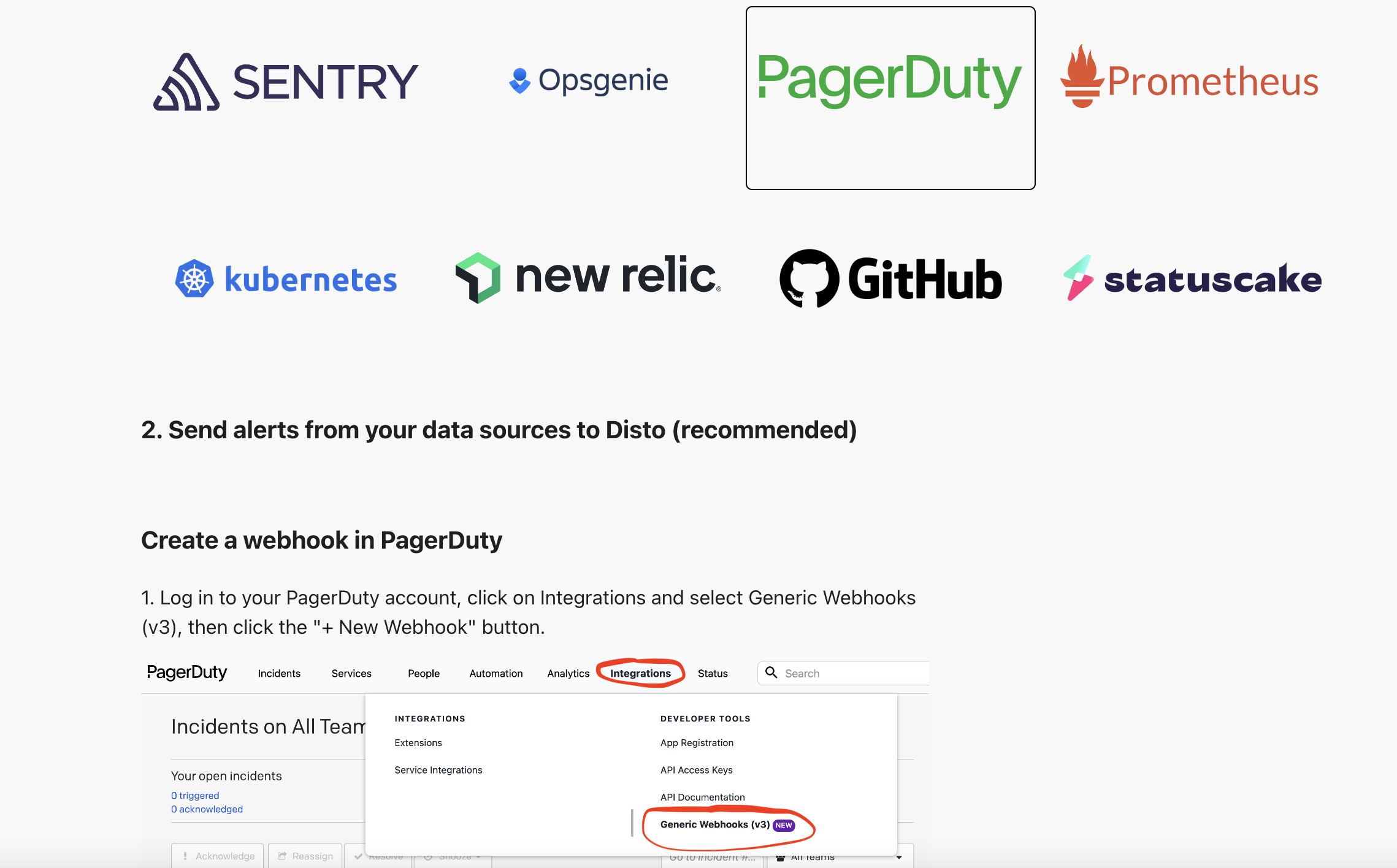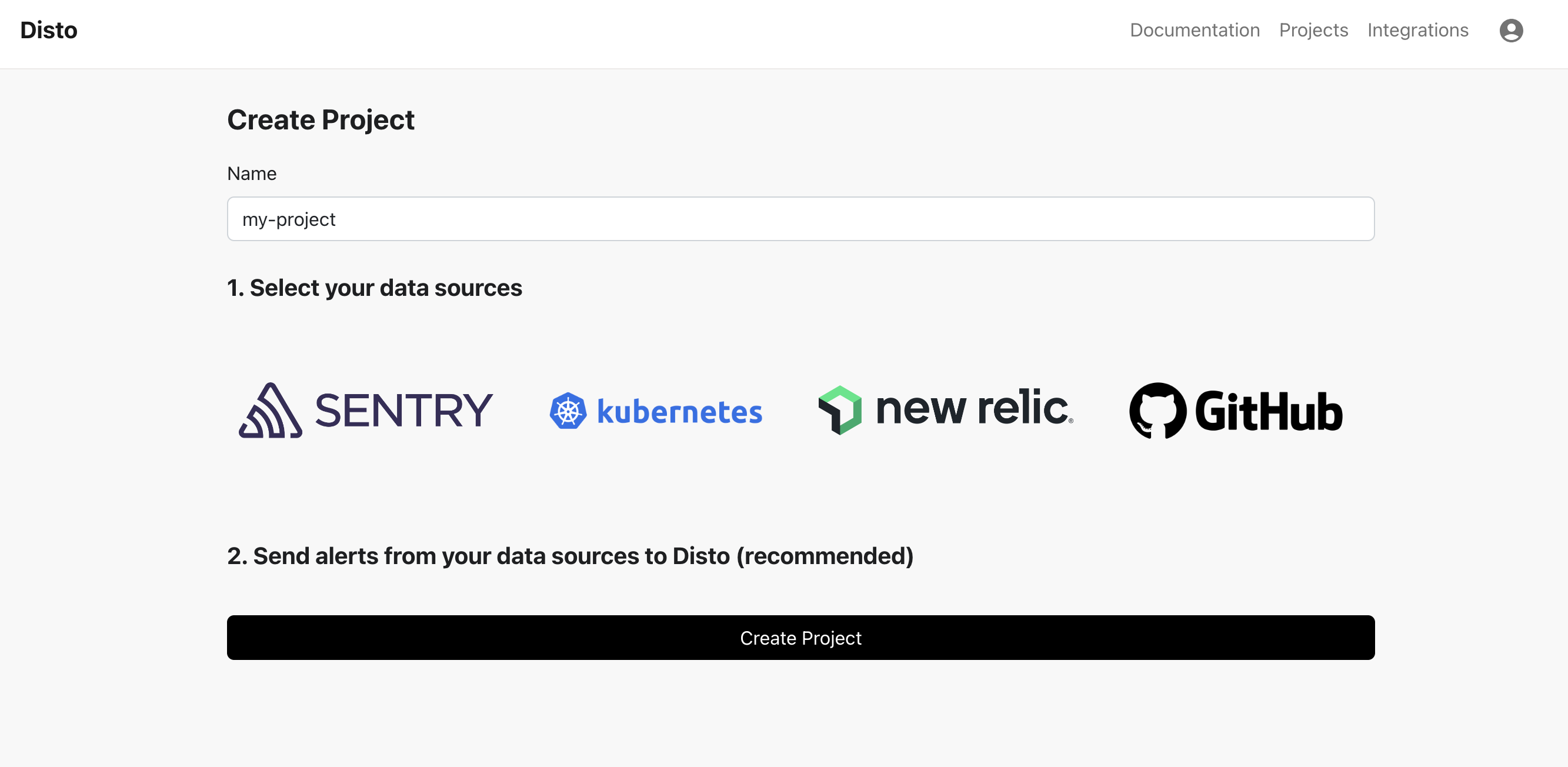 - If you have alerts set up in another tool, Disto can receive an event via webhook whenever an alert is triggered, and automatically start investigating the issue. If you are using a common tool that Disto has an integration for, you can follow the prompts in the Disto UI to set up a webhook when you’re creating a project.