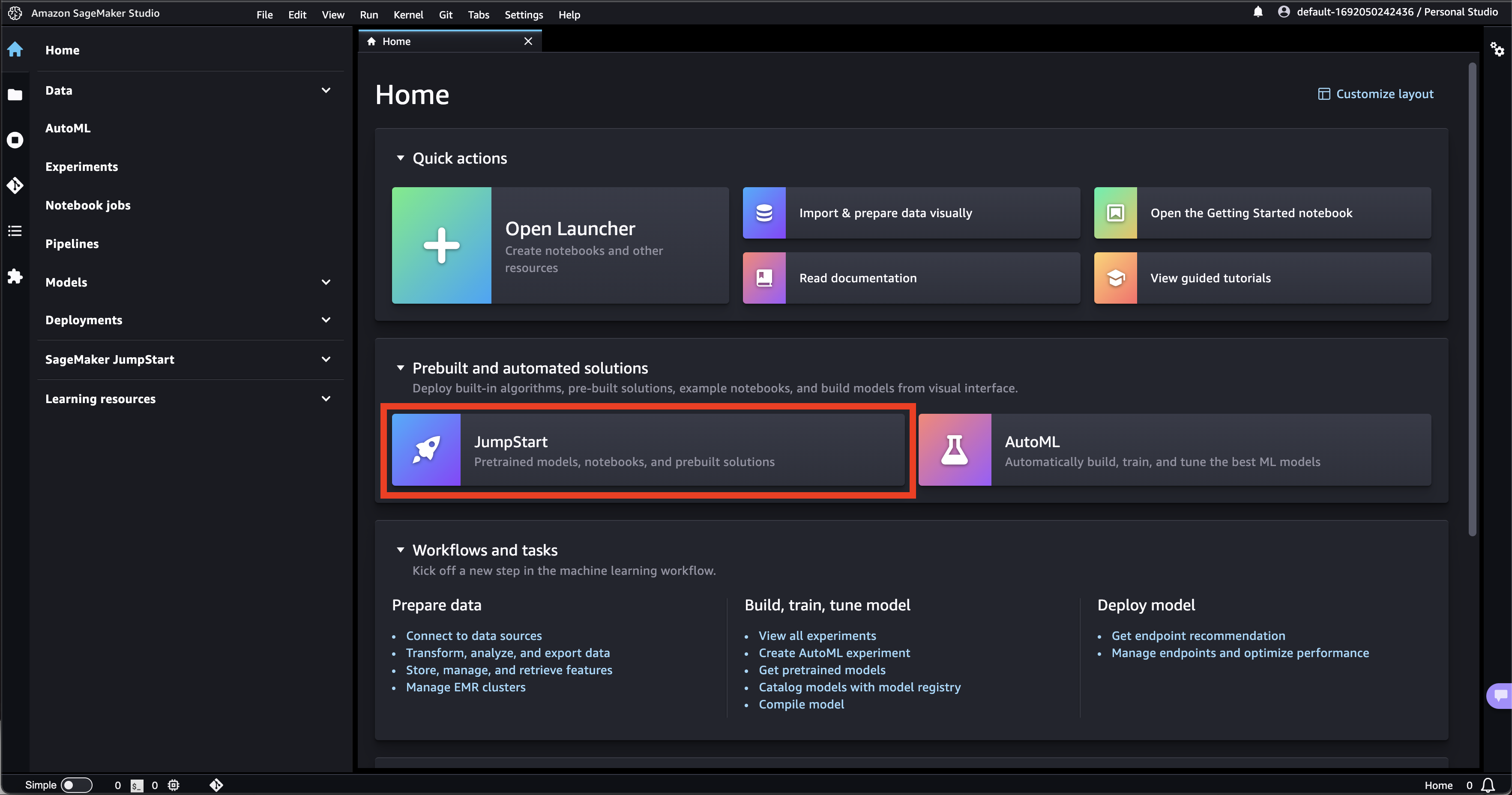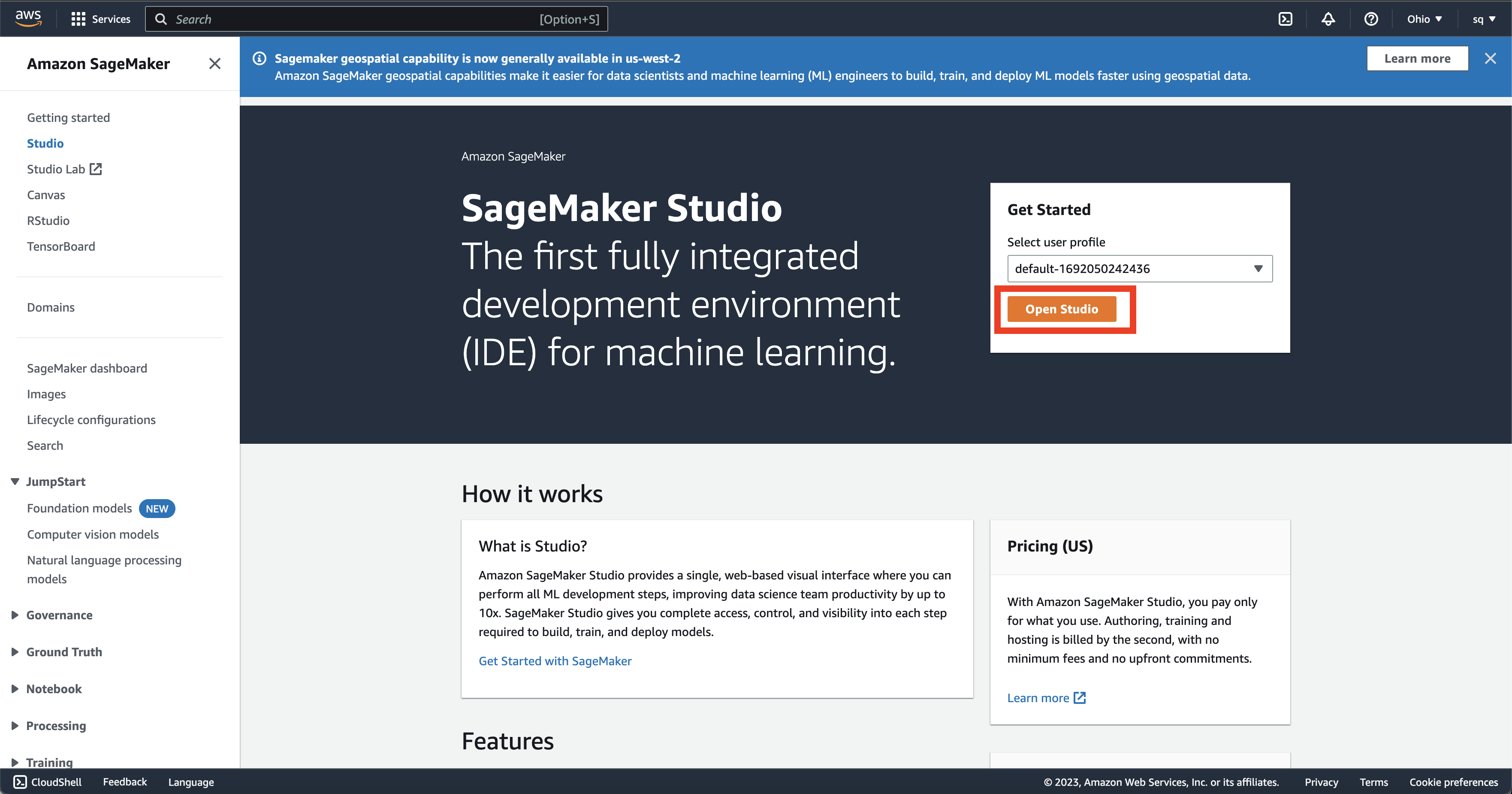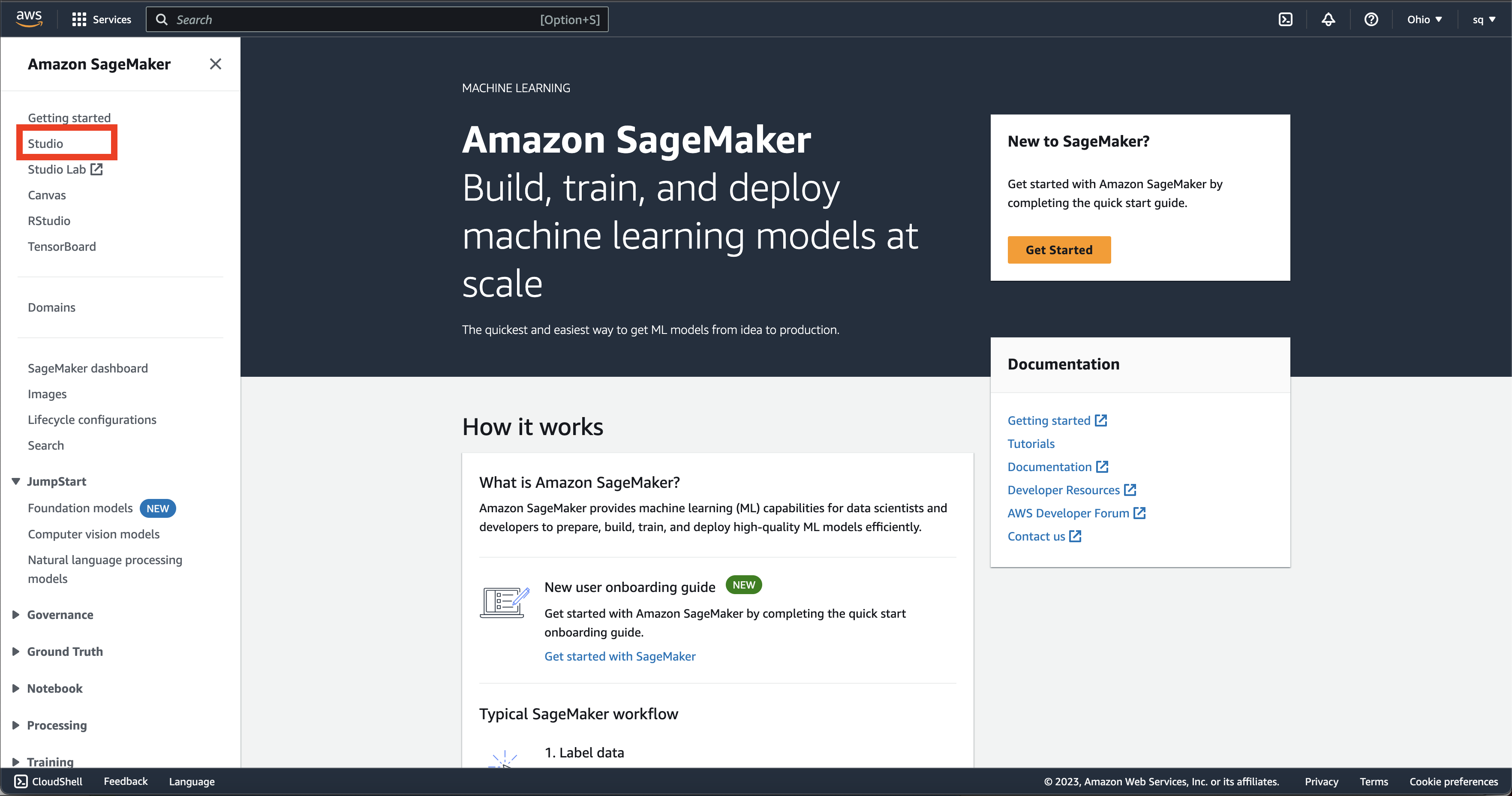 - Go to “Amazon Sagemaker” in the AWS console. Click on “Studio” in the left sidebar.