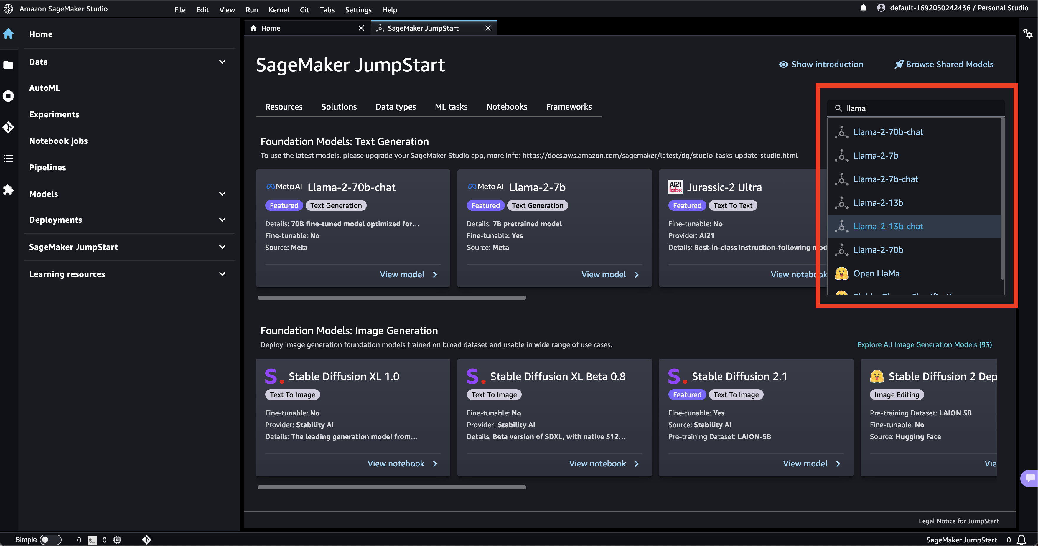 - Search for your preferred Llama model in the search bar and click on it. We recommend “Llama-2-70b-chat”, as it is most accurate, but you can choose a smaller model if you wish.