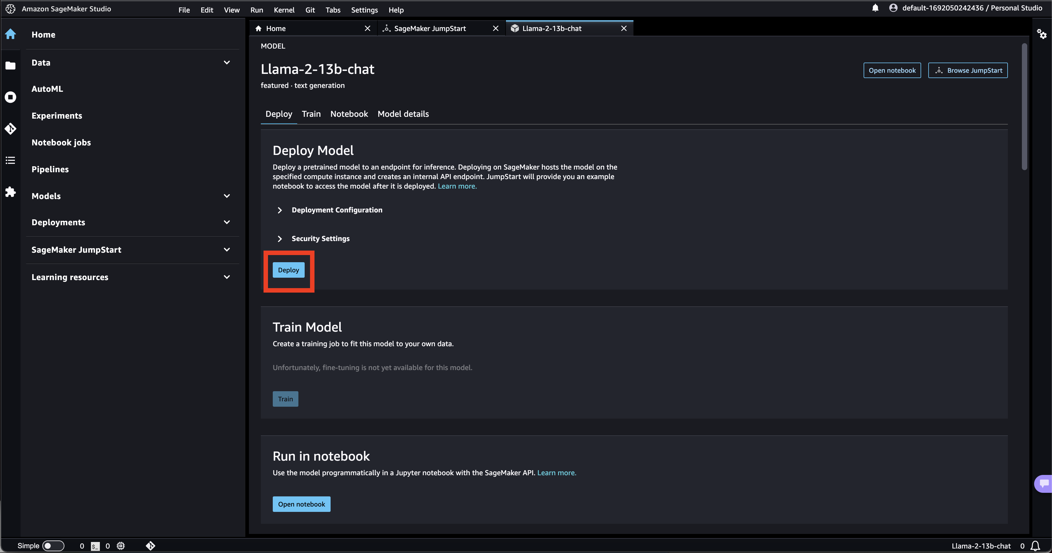 - Click on “deploy”. Wait for the model to deploy.